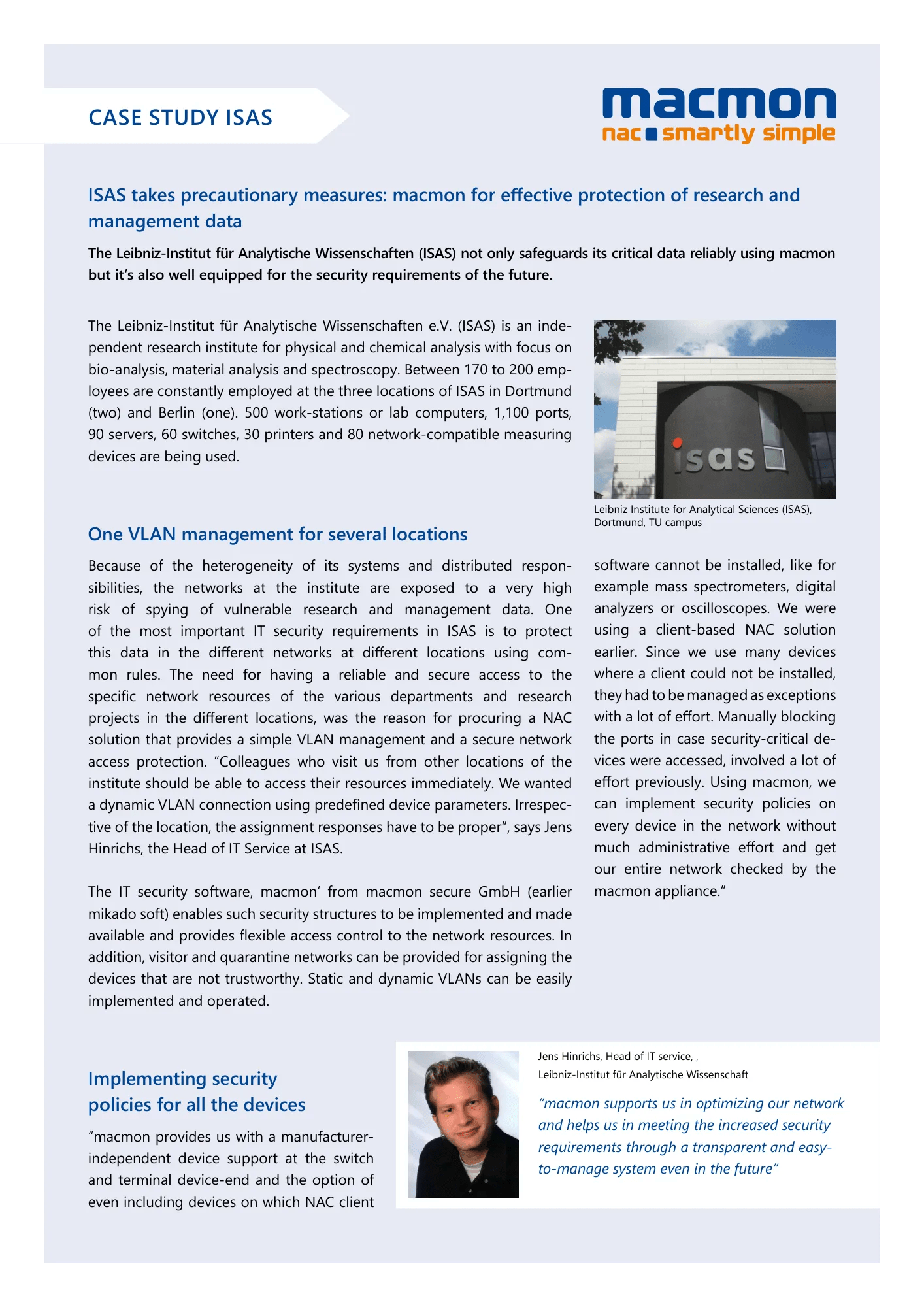 Leibniz Institute for Analytical Sciences utilise macmon NAC pour sécuriser les données sensibles de recherche et de gestion.