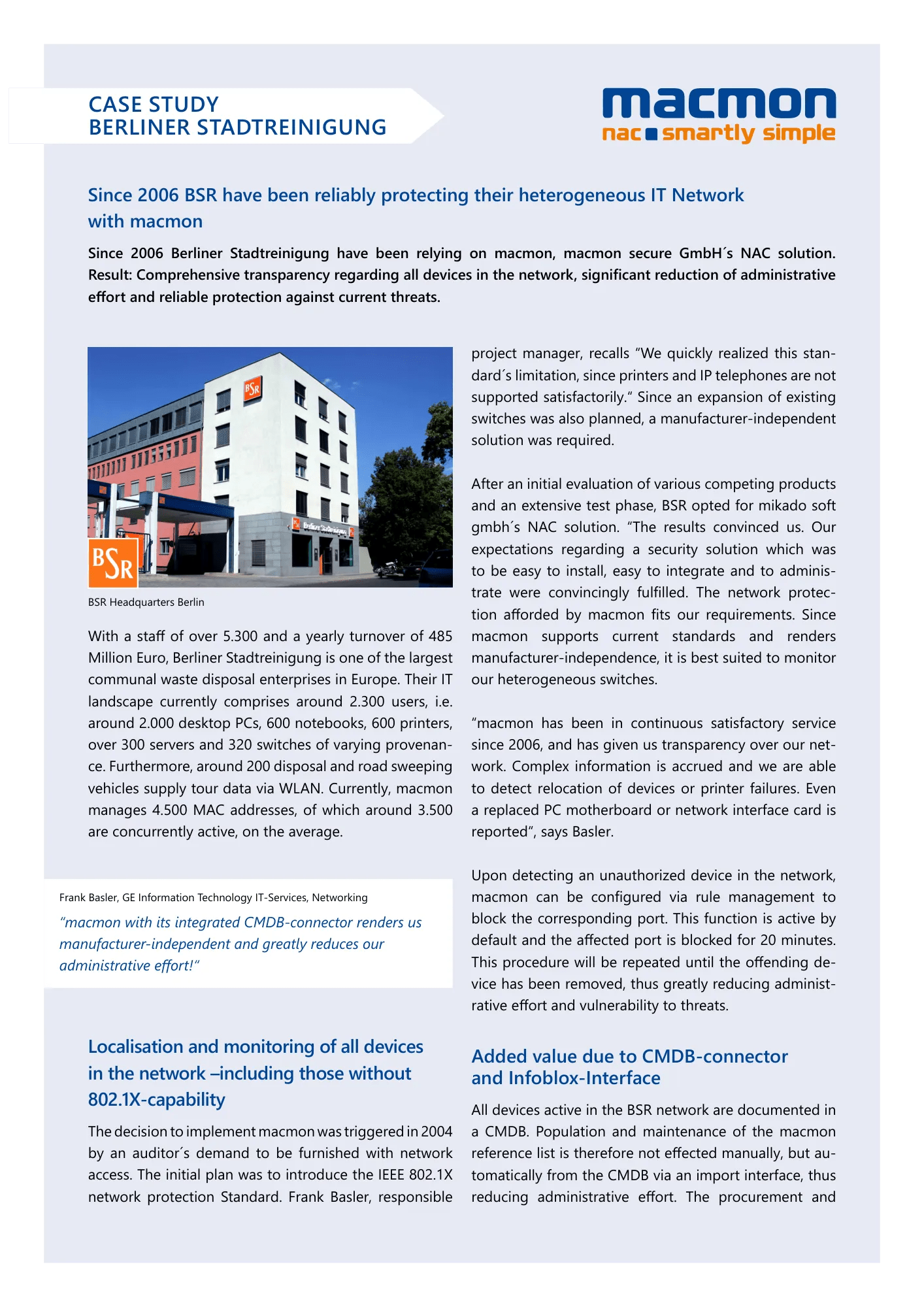 Les services de nettoyage urbain de Berlin (BSR) font confiance à macmon NAC pour protéger leur réseau informatique hétérogène depuis 2006.