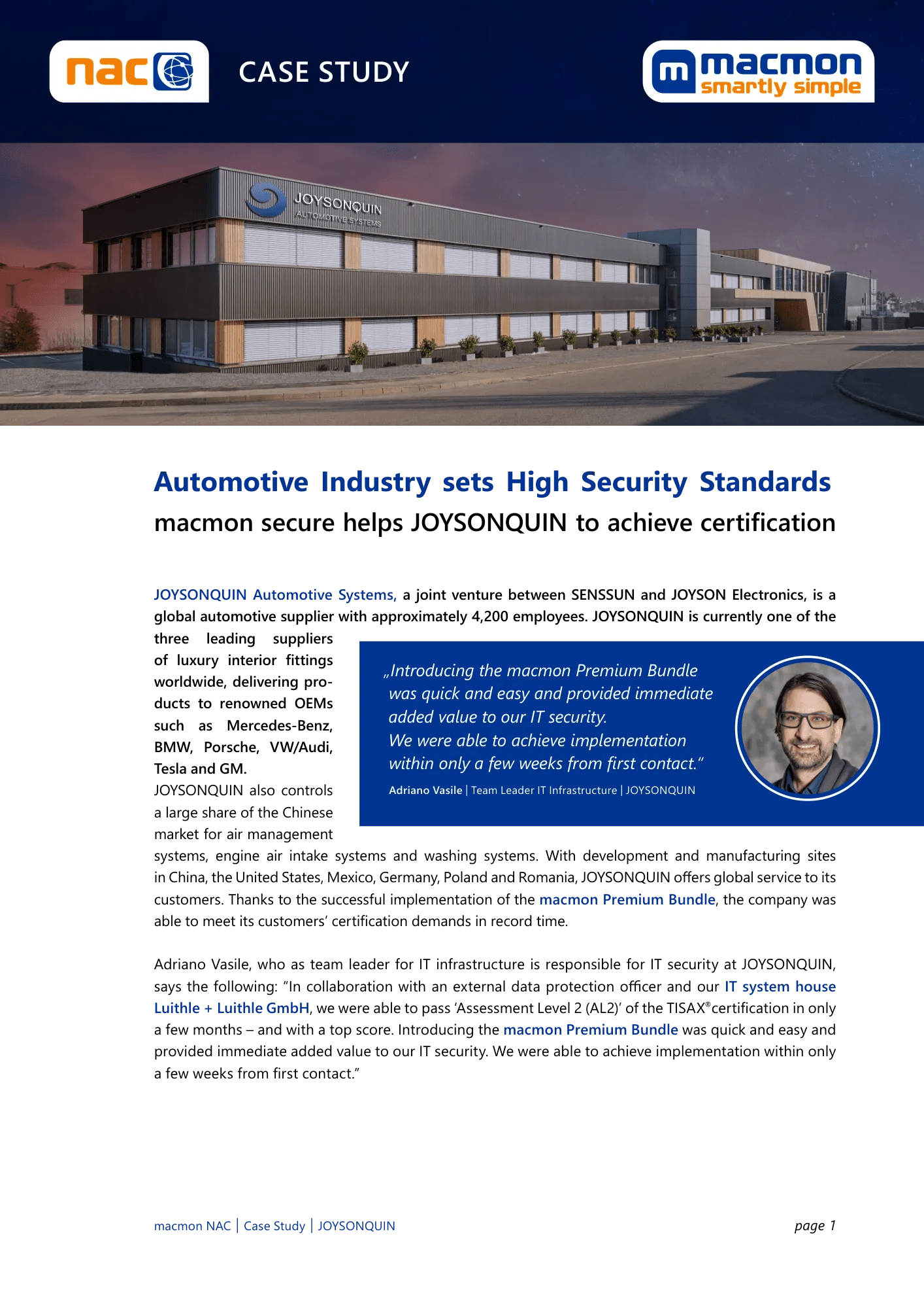 Le fournisseur automobile mondial d’aménagements intérieurs de luxe utilise macmon NAC pour la gestion centralisée de ses actifs.